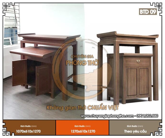 | Bộ bàn thờ bao gồm | Bàn thờ con, tấm chắn ám khói , tranh phòng thờ trang trí nếu cần ( mua thêm) |