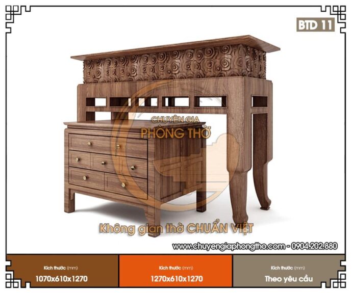 Bàn thờ thần tài THT07 được thiết kế hiện đại, chất liệu gỗ làm bàn thờ đa dạng từ gỗ sồi, gỗ gụ, gỗ hương, gỗ gõ,… phù hợp với nhiều sự lựa chọn của gia chủ: