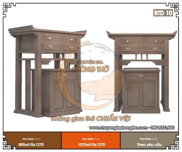 Sự giản đơn, công phu nhưng rất tinh xảo, nhẹ nhàng, trang nghiêm. Dạng bàn thờ đứng dành cho chung cư, nhà phố tạo sự quyến rũ từ cái nhìn đầu tiên. Bởi kích thước khá nhỏ, không thể trình bày quá nhiều hình thái trang trí. Các nghệ nhân đặt nặng chú trọng vào phần cổ cùng hình thái chữ Thọ cách điệu với đường triện rất vuông vức độc đáo.