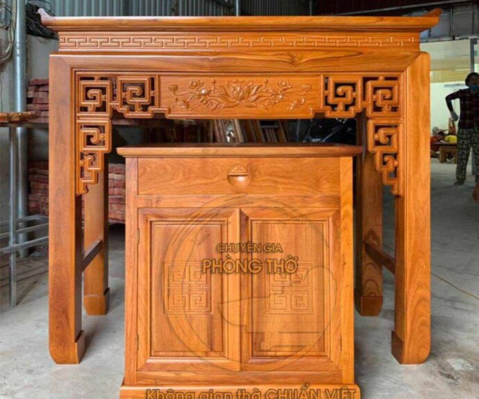 Tùy theo mong muốn của chủ nhà có thể lựa chọn thêm tủ cơm bên dưới giúp bày biện đồ thờ cúng sao cho thoải mái và đẹp mắt . Nhất là trong những dịp lễ lớn của gia đình của dòng họ như Tết, giỗ …